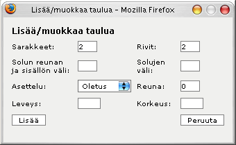 | Solujen väli | Taulun sisällä olevien solujen väli. |