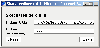 I detta fönster skriver du in URL:en till bilden du vill länka till samt en bildbeskrivning, denna beskrivning kommer att visas som en alternativ text till bilden.